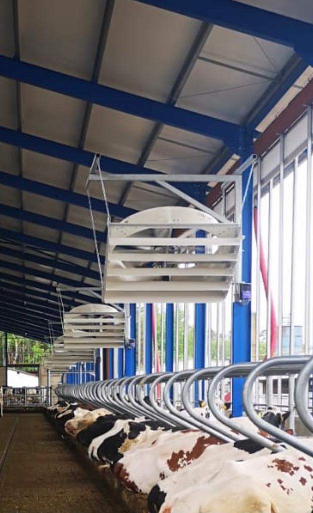 Många fläktar på marknaden kyler bara stallet. Men för att korna ska må bra behöver vi kyla just dem, Korna!